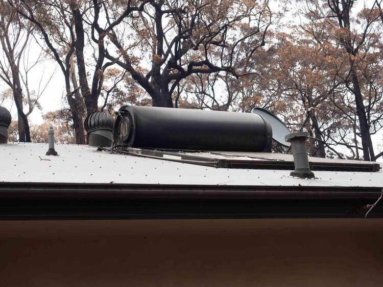 The other damaged external item is the roof-mounted hot water tank. The plastic cover on one end of that tank burnt – presumably because an ember lodged there. As a result, the adjacent solar hot water panel shattered.